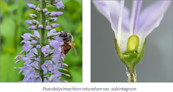 The mountain spike speedwell (Pseudolysimachion rotundum var. subintegrum) is a perennial plant that blooms in Summer (July-August) and a native species used for landscaping and traditional medicine. The plant contains phenylalanine, an amino acid preferred by honeybees, and its blooming period in summer when nectar plants are generally scarce makes it an important species for supporting pollinator ecosystems.