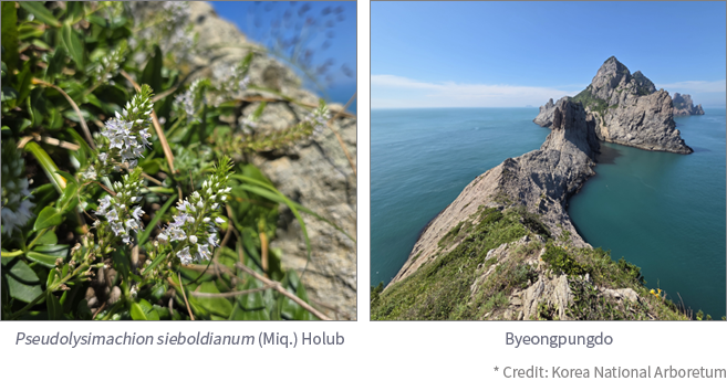 Approximately 20 individuals were found within an area of about 5m² on Myeongdo, and around 30 individuals within 20m² on Byeongpungdo. These plants grow naturally in crevices of coastal cliffs, suggesting that there may be additional undiscovered habitats in nearby areas.