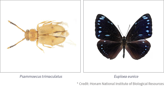 The tropical and subtropical insects identified in this study are species commonly distributed in low-latitude regions near the equator such as Okinawa (Japan) and India. In Korea, they were mainly found in southern island regions, six species including Psammoecus trinaculatus on Jeju Island and five species including Euploea eunice on Geojedo Island.